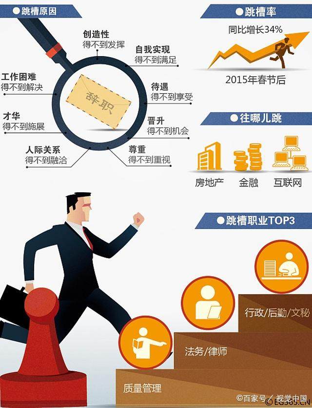 而無憂精英網上月發布的職場精英2018年春季跳槽意愿報告則顯示出了跳槽者的行業分布。在此項調查中,來自IT互聯網行業的白領們“跳槽率”較高,金融、房地產、汽車行業緊隨其后。 智聯招聘的報告還指出,導致白領們決定離開的原因,最常見的還是薪酬水平,調查結果顯示,有55.8%的白領表示對目前的薪酬不滿意。此外,企業發展前景不明、晉升受限和福利待遇三個因素也構成白領跳槽的主因,分別有42.9%、38.6%和36.6%的受訪者選擇了這些因素。